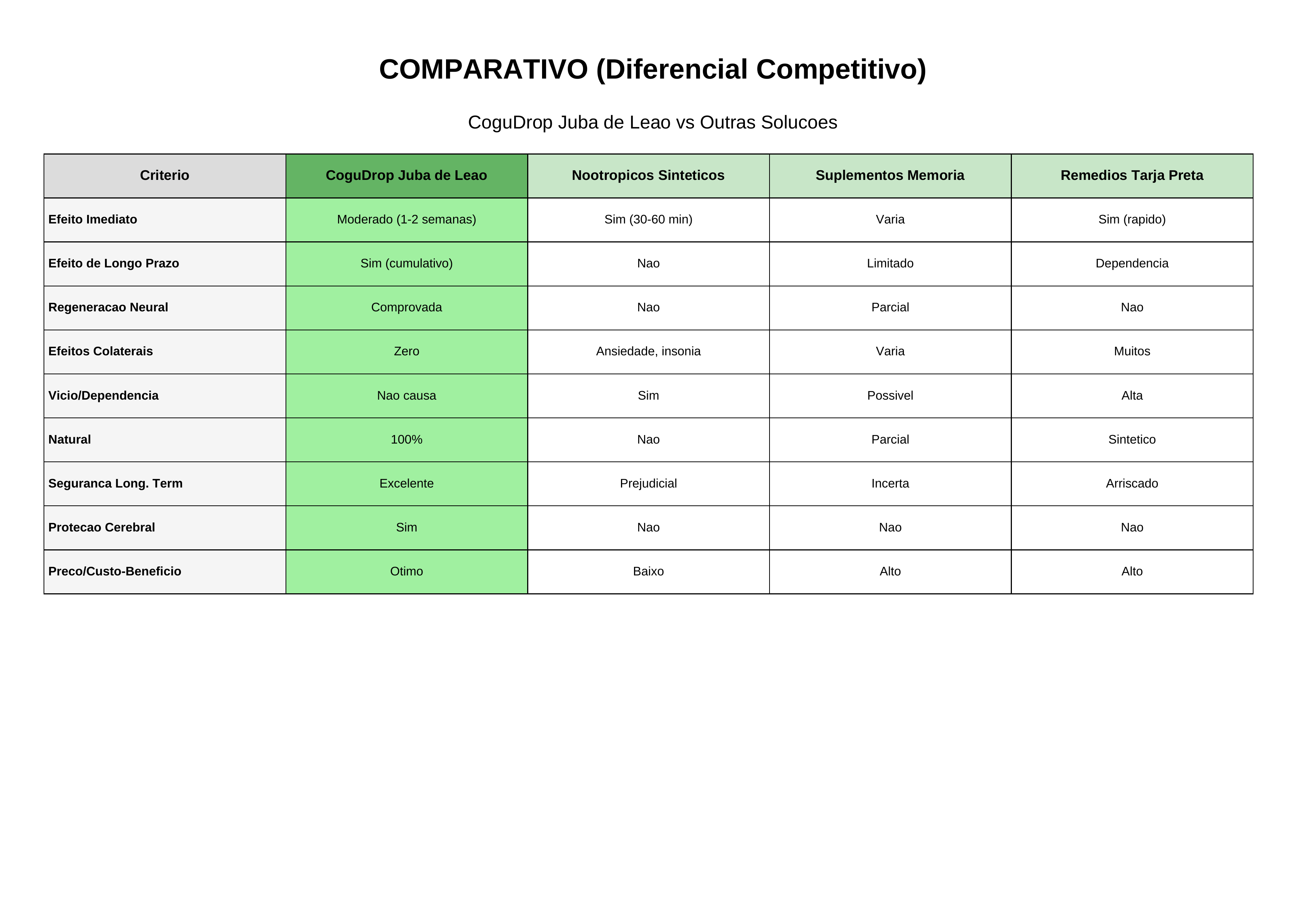 É o único nootrópico natural com comprovação científica de regeneração neural. Enquanto outros produtos apenas estimulam temporariamente, o CoguDrop reconstrói e protege seu cérebro de dentro para fora.