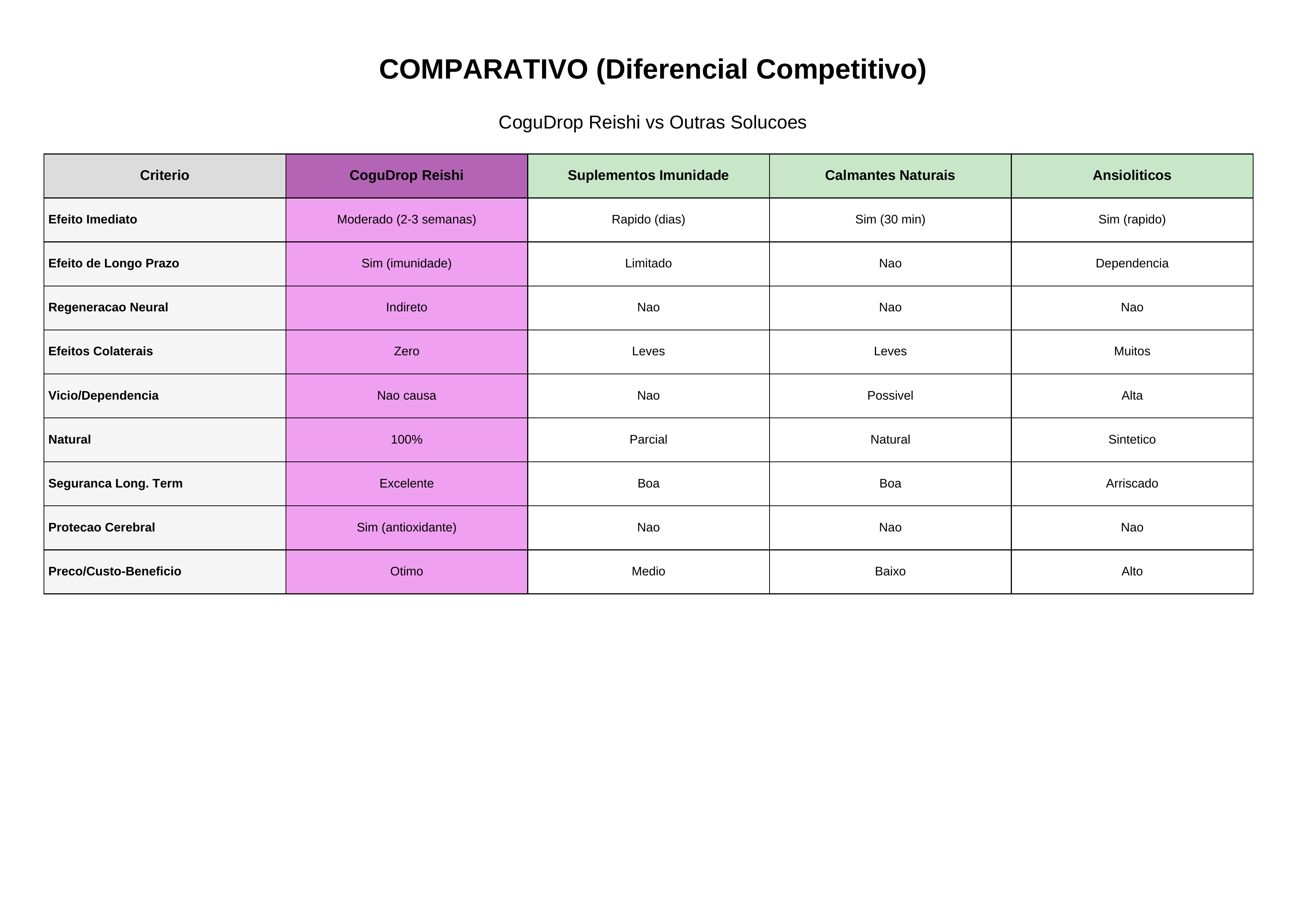 É o único nootrópico natural com comprovação científica de potencialização do relaxamento e fortalecimento imunológico. Enquanto outros produtos apenas mascaram os sintomas temporariamente, o CoguDrop reconstrói e protege sua capacidade de lidar com o estresse de dentro para fora.