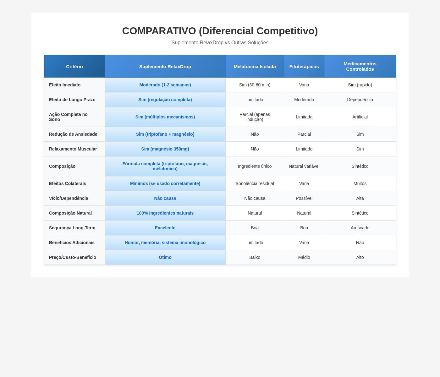 É a única fórmula com comprovação científica que combina os 3 pilares essenciais do descanso perfeito: regulação do relógio biológico + redução da ansiedade + sono profundo restaurador. Enquanto outros produtos apenas "derrubam" você, o RelaxDrop reprograma seu ciclo natural de sono.